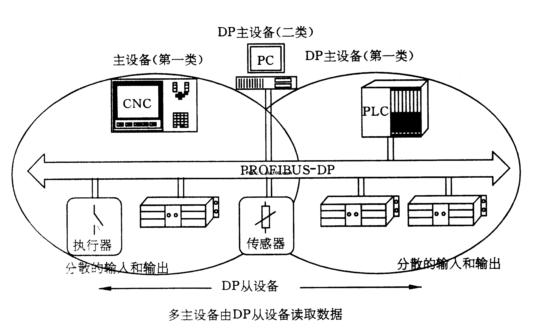每个PROFIBUS-DP系统包括3种类型设备:第一类DP主站(DPM1)、第二类DP主站(DPM2)和DP从站。DPM1是是中央控制器,它在预定的周期内与分散的站(如DP从站)交换信息。典型的DPM1如PLC、PC等;DPM2是编程器、组态设备或操作面板,在DP系统组态操作时使用,完成系统操作和监视目的;DP从站是进行输入和输出信息采集和发送的外围设备,是带二进制值或模拟量输入输出的I/O设备、驱动器、阀门等。